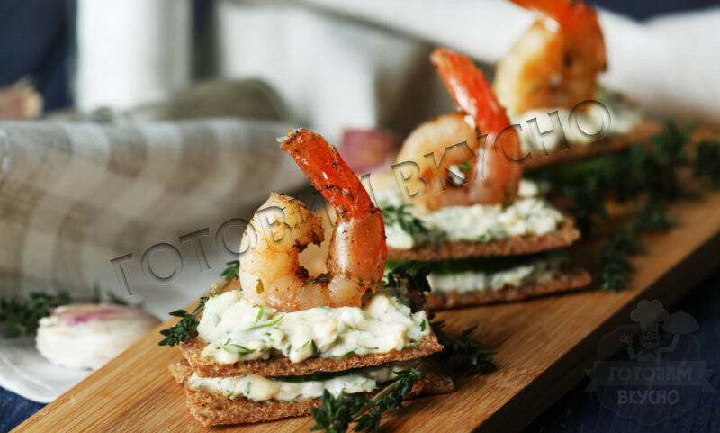 Креветочные канапе с творожной намазкой и хрустящими хлебцами