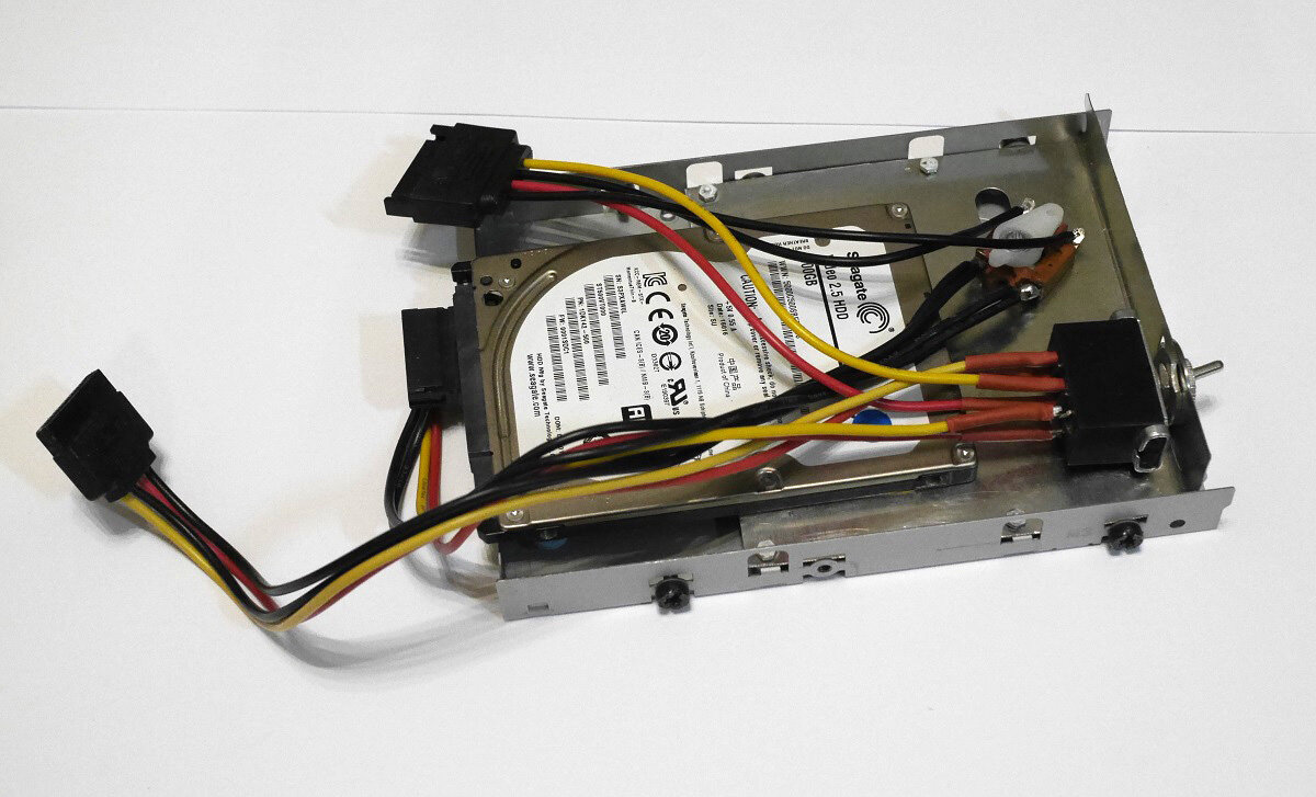 Место для тумблера в плотно заполненном компьютере проще всего найти, если воспользоваться не 3,5-, а 2,5-дюймовым жёстким диском, применяемым в ноутбуках. Для изготовления переходника с 3,5 на 2,5 дюйма предлагаем разобрать старый никому уже не нужный флоппи-накопитель.