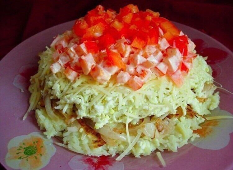 7. Майонез. Способ приготовления: 1. Картофель и куриные яйца отвариваем и трем на средней терке. 2. Лук нарезаем и обжариваем до золотистого цвета. При жарке немного солим. 3. Сладкий перец моем и нарезаем кубиками. 4. Ветчину режем кубиками. 5. Сыр необходимо натереть на средней терке. Салат укладываем слоями: картофель, лук, ветчина, яйцо, сыр, перец. Каждый слой смазываем майонезом. Приятного аппетита!