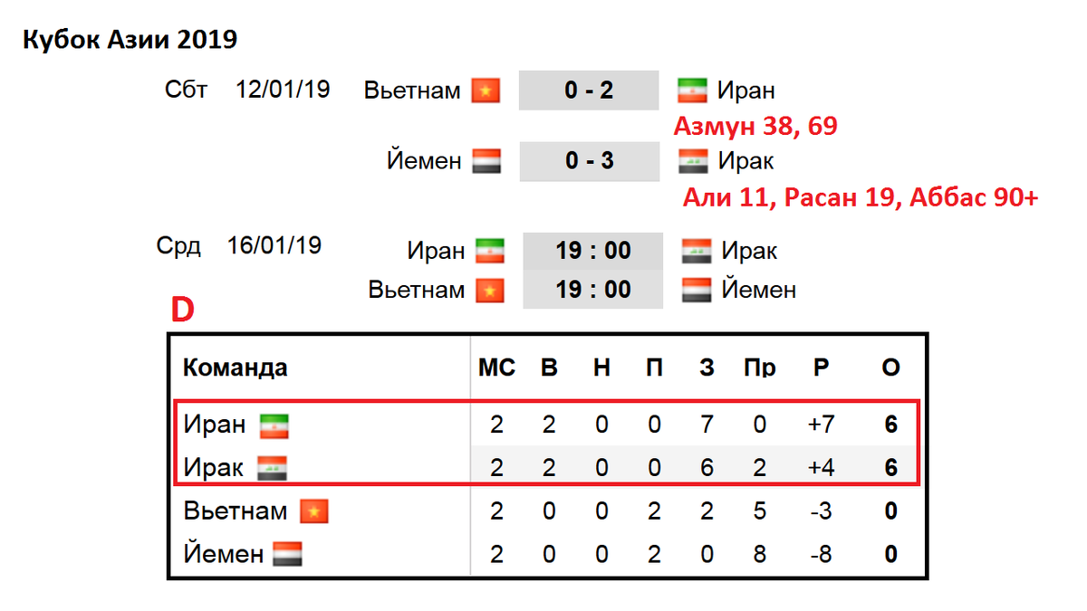 Привет всем! Это кубок Азии по футболу. Смотрим расписание, таблицы всех групп и результаты. Сегодня определились ещё несколько участников плей-офф. Давайте начинать обзор, если он вам понравится, поставьте лайк. В группе «D» Иран выиграл у Вьетнама за счет дубля Сердара Азмуна, который выступает в России в клубе Рубин. Он забивает в 3-й своей игре подряд. Перед кубком Азии он отличился в товарищеской игре с Катаром. Азмун выходит в лидеры среди бомбардиров, их посмотрим позже. Ну что ж, Иран идет уверенно, сборная не проигрывает на протяжении 9 игр. В этой же группе сыграли между собой Йемен и Ирак. Команды подходили к матчу с разным настроением, у Ирака была 5 – ти матчевая беспроигрышная серия, а у Йемена всё плохо, 4-х матчевая серия из одних поражений. Уже к 19 минуте счет был 2-0 в пользу иракцев, они и победили в итоге. Йемен проигрывает 5 матч подряд и не может даже забить ни единого гола. Больше года назад эти сборные встречались на кубке Персидского залива, Ирак побед