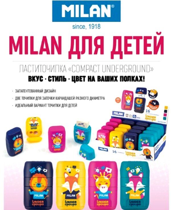 Ластиточилка "Compact Underground" от торговой марки Milan - идеальный вариант для детей. Сразу две точилки для заточки карандашей разного диаметра. Лезвия надежно закреплены соединительным винтом к корпусу точилки. Контейнер для стружки позволяет сохранить рабочее место в чистоте. Универсальный съемный ластик, удаляет различный тип графита с бумаги любого сорта, не повреждая ее поверхность. Точилка пластиковая с ластиком "Compact Underground" – это вкус, стиль, и цвет. Источник - kanzoboz.ru