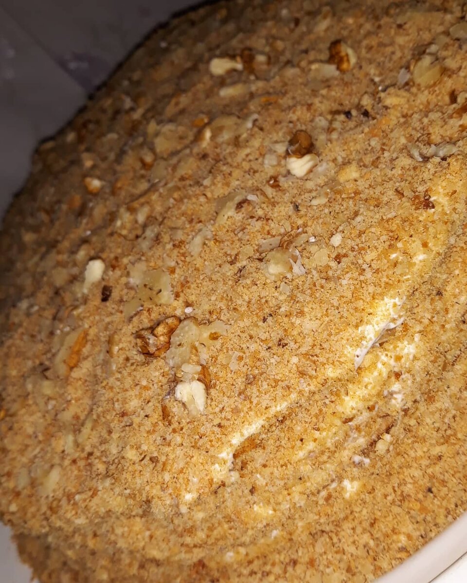 - Рецепт "Медовика" с нежнейший сметанным кремом для торта . Ингредиенты для медовика: . для теста: . 100 грамм сливочного масла . 2 ст.л. мёда . 2 куриных яйца . 130 грамм сахара . 1,5 ч. л. соды . 1,5 ч. л. уксуса или лимонного сока . 500 грамм муки . для крема: . 100 грамм сливочного масла . 200 грамм сахарной пудры . 600-700 грамм сметаны (жирностью 20%-30%) Дополнительно можно добавить 100 грамм цукатов 50 грамм грецких орехов ... Рецепт: 1. В маленькую кастрюльку из нержавейки положите мёд и масло, кастрюльку с ингредиентами поставьте на водяную баню, помешивайте смесь пока масло не растопиться, и не станет однородным с мёдом. Соду гасим уксусом или лимонным соком и добавляем к маслу и мёду интенсивно помешивая венчиком. Масса должна стать легкой и воздушной как пена. 2. В глубокой миске смешайте яйца с сахаром и хорошо взбейте массу до пышной белой пены (если любите аромат ванили, то можно добавить пакетик ванилина - 1 грамм) 3. Продолжая взбивать яйца медленно так чтобы яйца не свернулись, вводим массу с маслом и мёдом в смесь с яйцами очень и очень аккуратно. 4. Порциями добавляем просеянную муку (у меня где-то уходит, приблизительно грамм 500), когда миксером становится тяжело взбивать, высыпаем оставшуюся муку на стол, перелаживаем и тесто на стол и продолжаем замешивать руками до однородности и эластичности. 5. Разделить тесто на 7 одинаковых частей. 6. Раскатайте на пергаменте каждый шарик в тонкий корж, тарелкой нужного диаметра сделайте круг, края (обрезки) немного убрав в стороны, а сам круглый коржик прокалываем вилочкой. 7. Перекладываем пергамент с коржом на противень. Выпекаем 3-5 минут при температуре 180 °С. 8. Остудите коржи, обрезки с коржика и орехи измельчите в блендере, или скалкой. 9. Сделайте крем из сметаны, сахарной пудры и масла: . взбив миксером сначала масло с сахарной пудрой (добавляю в крем ещё пакетик ванилина 1 грамм), и постепенно, порциями добавляя сметану. Я на каждой скорости взбиваю по 3 минуты, и каждую минуту добавляю по 2 ст. л. сметаны. Так даже из 21 % сметаны, получается очень воздушный крем. Взбивайте пока смесь не станет похожа на взбитые сливки, по времени минут 15. 10. Собираем торт промазывая коржи с каждой стороны получившимся сметанным кремом, и посыпая крошкой из орехов и измельченных коржей (обрезков) каждый слой (также между слоями можно положить чернослив или цукаты). 11. Обсыпаем медовик, оставшейся крошкой из орехов и измельченных коржей, со всех сторон и естественно сверху. 12. Оставляем торт на 2 часа при комнатной температуре, чтобы он пропитался, а потом ставим ещё на 8-10 часов в холодильник.