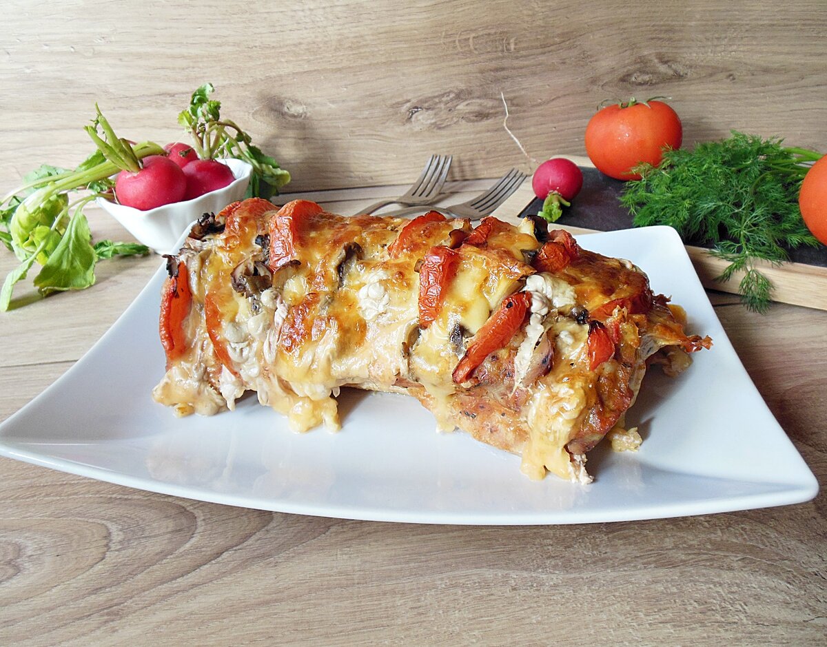 Порадуйте своих близких вкусным мясом приготовленное по особому рецепту в духовке. Такое блюдо даже не стыдно подать на праздничный стол. Мясо получается нежным, сочным, ароматным! Ингредиенты: 1. Свиная вырезка - 1 кг. 2. Помидор - 2 шт. 3. Шампиньоны - 150 гр. 4. Твердый сыр - 150 гр. 5. Чеснок- 3 зубчика. Для маринада: 1. Растительное масло - 2 ст. ложки. 2. Соевый соус - 2 ст. ложки. 3. Горчица - 1 ст. ложка. Способ приготовления: 1. Свиную вырезку следует тщательно промыть, промокнуть сухим полотенцем, чтоб на мясе было минимум влаги. По всему мясу делаем надрезу, расстояние между которыми должно быть не менее 1,5 - 2 см. 2. Помидоры нарезаем кольцами, сыр квадратами, грибы тоненько нарезаем. Чеснок измельчить. В надрезы выкладываем помидор, грибы, сыр и чеснок. 3. Теперь готовим маринад. Для этого следует смешать в глубокой миске растительное масло, соевый соус и горчицу. 4. Мясо выложить в форму для запекания и обильно полить маринадом. 5. Запекать следует в разогретой духовк