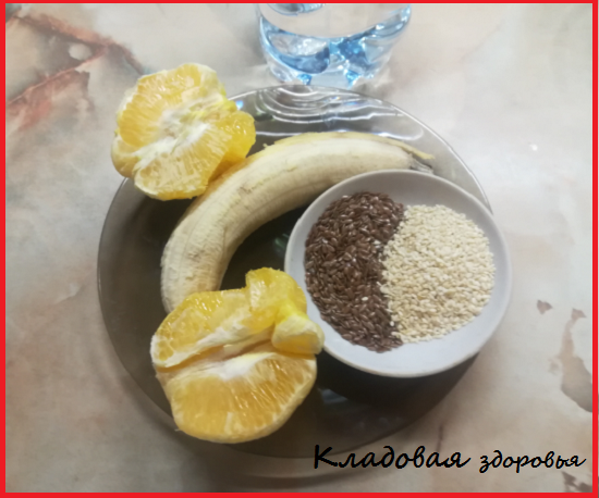 Время от времени я стараюсь делать для себя маленькие радости, а именно, готовлю вкусные и полезные напитки, которые помогают укрепить здоровье. Вот сегодня готовила и сразу делала фотографии на камеру телефона, спешу поделиться с вами. Напиток состоит из простых продуктов, всего 4 наименования и + негазированная минеральная вода. Это квартет 4 продуктов, запоминайте, что понадобится: В самом конце приготовления понадобится еще стакан воды, чтобы разбавить фруктовую смесь для питья. А теперь давайте попробуем разобраться , чем так хорош и полезен напиток здоровья? Банан не только вкусен, но и полезен содержанием ценных углеводов, клетчатки, витаминов. В нем содержится пектин, вещество полезное для пищеварения. Также в нем содержатся необходимые нашему организму микроэлементы, такие как калий, железо, фосфор, магний, кальций. Этот экзотический фрукт способен положительно влиять на кровяное давление, он не вызывает запора и вздутия живота, если присутствует в напитке. Кунжутные и льняные