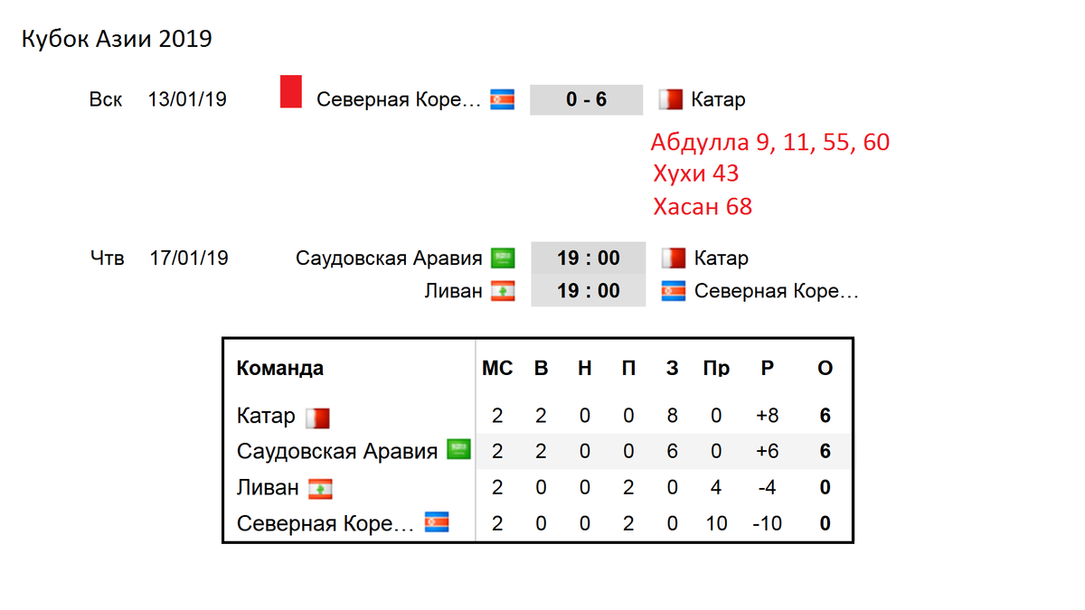 Привет. 9-й день на кубке Азии. Даёшь 500 лайков, чтобы «спортивный» продолжал пилить выпуски про этот замечательный турнир. Друзья, завершился полностью второй тур во всех группах, подведем в этом выпуске промежуточные итоги. Самый результативный матч на турнире, это Северная Корея – Катар. Игра прошла сегодня, хозяева будущего ЧМ победили в сухую (6-0). В этой игре Абдулла оформил покер. Выступает он в катарской премьер-лиге. И за последние 5 своих матчей, отличился в 4-х из них. Ещё в этой игре у него голевой пас. На кубках Азии, в среднем, лучший бомбардир забивает, за весь турнир, 5-6 голов. У Абдуллы уже 5-ть. Так что, возможно, он станет лучшим. Интересная становится ситуация среди голеадоров. У Северной Кореи в компенсированное время был удален игрок. Это 4-я красная карточка на турнире. В 2017 году эти сборные сыграли между собой 2-2. У Саудовской Аравии в таблице 6 очков. Катар набирает столько же и становится 7-м по счету участником плей-офф. Обе сборные голов ещё н