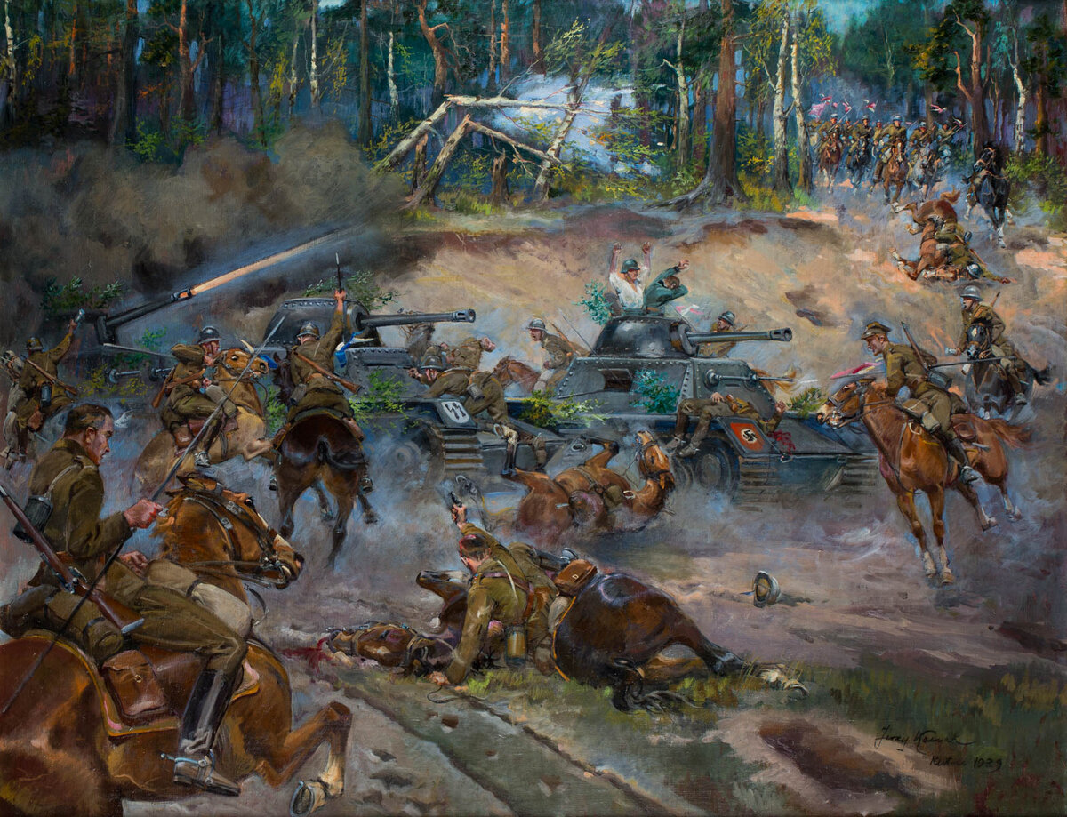 Взгляните на картинку вверху. Нет — это не насмешка, не пародия, не злая карикатура. Это картина польского художника Ежи Коссака «Битва под Кутно в 1939 г.» Всё на полном серьёзе. Польские кавалеристы с пиками наперевес атакуют, немецкие танкисты сдаются в плен... Особенно забавно выглядит это художество в глазах тех, кто не страдает амнезией и помнит о том, что Польша была разгромлена немцами за три недели — после чего, на несколько лет, польское государство вообще исчезло с лица земли.