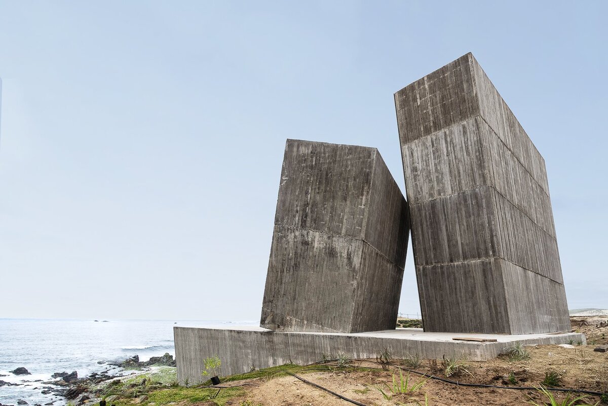 Два из выветрившихся бетонных объемов опираются друг на друга, как строительные блоки. Основной объем распространяется на четыре уровня.