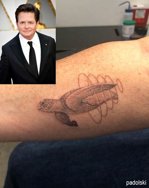 Немного запустил я тему наколок в своем посте и этой публикацией хотел бы её продолжить. А рассказать я сегодня, и в последующих постах, про наколки, которые делают себе знаменитости. К сожалению, базу про наколки наших местных звезд собрать не удалось, но с рисунками на телах забугорных публичных личностей в Интернете - пруд пруди. 001. И начать я хотел бы с наколочки одной эпохальной в свое время личности - Майкла Дж. Фокса. Этот актер так и остался для меня звездой одной роли в фильме - "Назад в Будущее", где он сыграл семнадцатилетнего Марти Мак Флая. Были у него и другие, наверняка неплохие, роли, но я их, честно говоря, не помню. Так вот Майкл 9 января уже этого, 2019 года, в свой Инстаграм выложил вот эту фотографию своей наколки. В свои 57 лет - это первый для него несмываемый рисунок на коже. На его страничке ни слова о причинах и смысле этого рисунка, просто фраза «Первая татуировка, морская черепаха, длинная история» ». 002. Молодая американская актриса сериалов