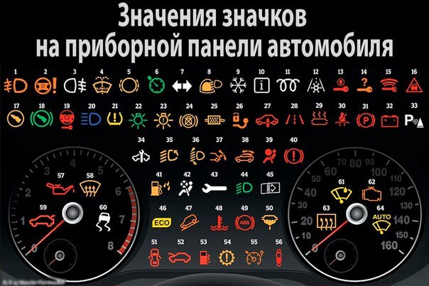 Вам знакома такая ситуация: на приборной панели вдруг начинает мигать какой-то символ, которого вы никогда раньше не видели? И вы понятия не имеете, что он означает? Спрашивать как-то неудобно, да и не у кого. Срочно ли это? Можно ли отложить до завтра? Может, вызвать экстренную помощь? Мы решили избавить вас от этих мучений! В наших инфографиках собраны 64 наиболее распространённых символа приборной панели разных автомобилей. Теперь вы сможете не только почувствовать себя увереннее за рулём, но и щегольнуть своими познаниями перед другими автолюбителями! 1. Противотуманные фары (передние). 2. Неисправность усилителя рулевого управления. 3. Противотуманные фары (задние). 4. Низкий уровень жидкости стеклоомывателя. 5. Износ тормозных колодок. 6. Значок включённого круиз-контроля. 7. Включены поворотные сигналы. 8. Датчик дождя и света. 9. Зимний режим. 10. Индикатор информационного сообщения. 11. Индикация работы свечи накаливания. 12. Мороз. 13. Индикация обнаружения бесконтактного