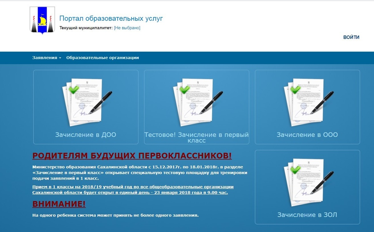 Министерство образования Сахалинской области информирует о том, что до 18 января на портале образовательных услуг Сахалинской области в разделе "Зачисление в первый класс" http://detsad.admsakhalin.ru работает специальная тренировочная площадка. Она открыта для родителей, чьи дети в 2019/2020 учебном году пойдут в первый класс. На данной площадке родители будущих первоклассников могут потренироваться, как правильно заполнять заявление о приеме в 1-й класс. При этом, необходимо иметь официальную регистрацию на сайте Госуслуг. Официальная областная кампания по приему в 1-й класс во все общеобразовательные организации Сахалинской области стартует в единый день — 22 января 2019 года в 9:00ч.