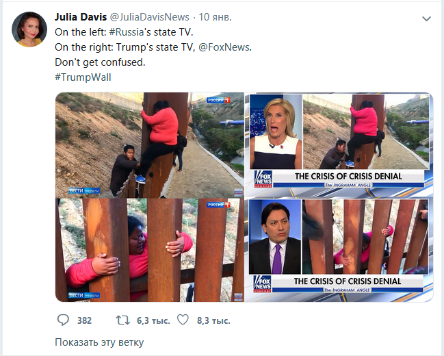 Julia Davis - колумнист, комментатор СМИ: -Россия поддерживает республиканцев и Россия устроила шатдаун в Америке, чтобы побороть демократов. Из её твиттера: "Слева кадры на российском телеканале. Справа: кадры на телеканале Трампа. Не перепутайте" "Российское государственное телевидение самодовольно обсуждает стену Трампа: "очень спорное решение", "колоссальная растрата", "причина бездумной остановки деятельности правительства". Золото, а не пропаганда - если вы сидите в Кремле, что тут не любить?" "Российское телевидение чрезвычайно волнует тема "шатдауна" и того хаоса, который будет происходить в США, если Трамп объявить чрезвычайное положение, в котором, кстати, он же и будет виноват. "Тогда мы наконец победим Америку", - саркастично усмехаясь, замечает ведущая Олька Скабеева" "Есть что-то глубоко ироничное в том, что во время просмотра российских новостей, YouTube предлагает мне пройти опрос на тему "Одобряете ли Вы президента Трампа?" Julia Davis в Twitter