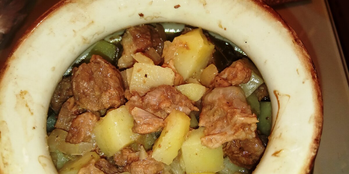 Ароматное жаркое в горшочках — вкусное порционное блюдо. Основные компоненты — мясо с картошкой. Говядину по желанию заменяют свининой или курицей. Совет: если вы решили готовить со свининой или курицей, то нарезанный картофель отварите 10-15 минут перед помещением в горшочек. В этом случае мясо не переварится и сохранит свой вкус. Рецепт на 6 горшочков. Для приготовления: 1. Говядина - 1500 гр. 2. Картофель - 2000 гр. 3. Лук репчатый - 350 гр. 4. Соль, перец, лавровый лист - по вкусу. 5. Зелень - 30 гр. Говядина, для этого блюда, подойдёт любая. Не стоит выбирать мягкую часть тушки. В горшочках оно томится 1,5 часа, поэтому в готовом виде будет нежным. Нарезаем мясо крупным кубиком и делим на 6 горшочков. Очищенный лук режем соломкой. Закладываем в горшочки. Солим, перчим и добавляем по 1/4 лаврушки в каждый горшочек. По желанию добавляем мелко нарезанный чеснок. Картофель моем, очищаем нарезаем средним кубиком. Раскладываем по горшочкам. Закрываем крышками и ставим в разогрету