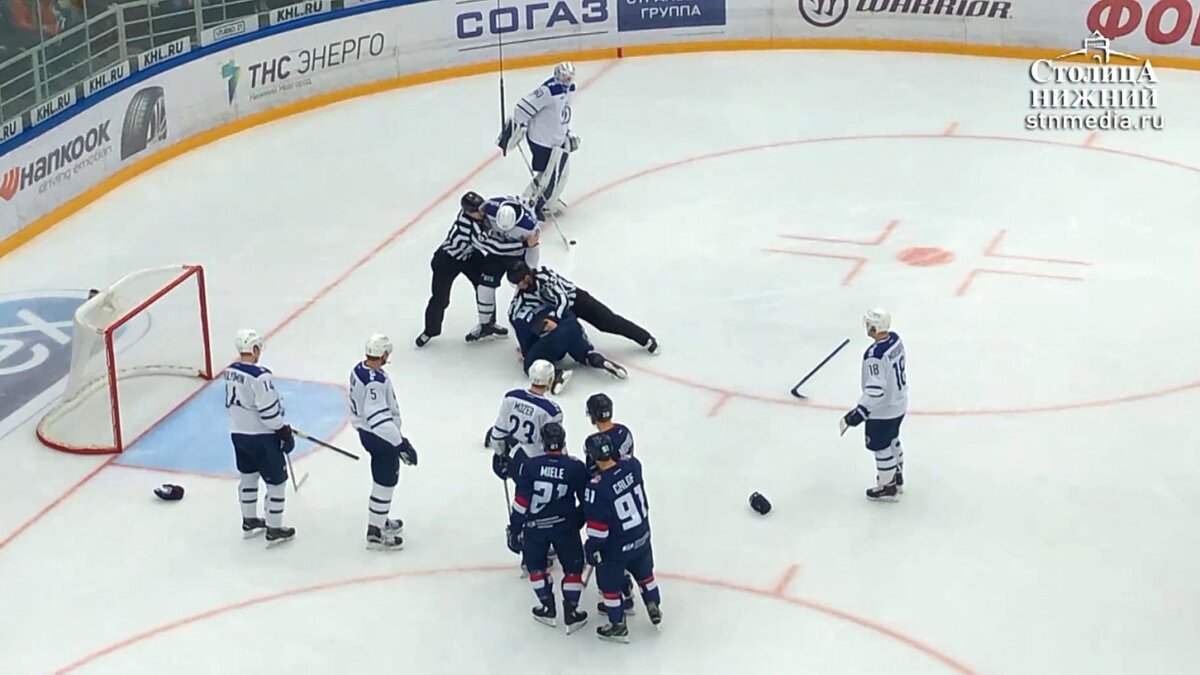 Спортсмены ХК «Торпедо» и ХК «Динамо» во время матча чемпионата КХЛ устроили драку