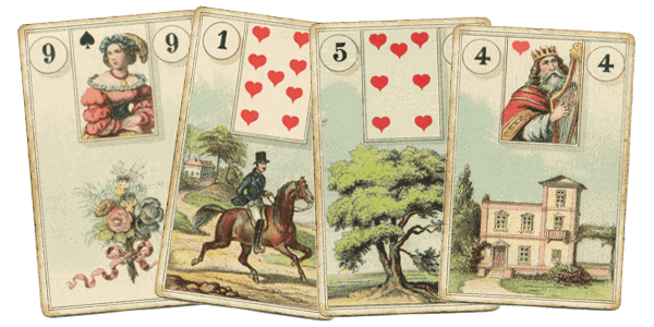 Триады. Классически в раскладах с картами Ленорман работа идет с триадами (выкладка по три карты сразу). В рамках школьной программы изучения диагностических методов мы даём программу сочетаний колоды Ленорман, в которой указаны сочетания двух карт. Часто задают вопрос: почему сочетания только двух карт, ведь мы читаем по три карты. Это делается именно для того, чтобы трактующий задумался и имел возможность вникнуть в суть проходящего касаемо именно данного расклада. Карт всего 36, а людей миллиарды, у каждого своя судьба и жизненная ситуация. В жизни не бывает «копирки», как нет ее и в раскладах на каждую конкретную ситуацию. Прописывать сочетание триад не имеет смысла. Пользуясь шаблонами, мы не всегда можем уловить главное, то, что нам говорит наш покровитель. Всегда нужно место для лавирования. Все предсказательные методики основаны на небольшом искажении существующей действительности (гадание на воде, хрустальный шар). Мы проникаем в тонкие планы материи, и для проникновения нам нужно искажение, место для знаков. Так и в «стандартных» сочетаниях – они лишь костыли, подпорка, но главное – слушать себя и того, кто вам подсказывает.