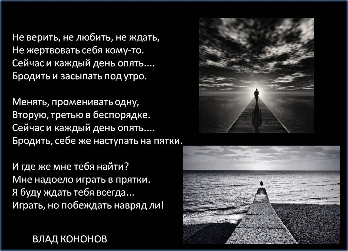 ●▬▬▬▬๑۩۩๑▬▬▬▬▬● Не верить, не любить, не ждать, Не жертвовать себя кому-то. Сейчас и каждый день опять.... Бродить и засыпать под утро. Менять, променивать одну, Вторую, третью в беспорядке. Сейчас и каждый день опять.... Бродить, себе же наступать на пятки. И где же мне тебя найти? Мне надоело играть в прятки. Я буду ждать тебя всегда... Играть, но побеждать навряд ли! ██░░░█░░░░░/СПАСИБО/░░░░░█░░░██