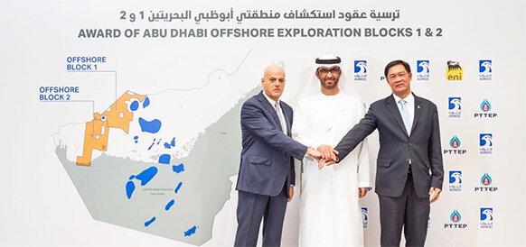 Абу-Даби, Шарджа, 14 янв - ИА Neftegaz.RU. Глава Eni К. Дескальци посетил Объединенные Арабские Эмираты, обеспечив расширение присутствия компании в эмиратах Абу-Даби и Шаржда. 12 января 2019 г. в Абу-Даби К. Дескальци, глава ADNOC А. аль-Джабер и гендиректор таиландской PTT Exploration and Production Company Limited (PTTEP) Ф. Тависин подписали 2 концессионных соглашения о приобретении долей участия в 2 разведочных блоках на шельфе Абу-Даби. Eni получает 70% в 35-летних концессионных соглашениях по Offshore Block 1 и Offshore Block 2. Оставшиеся 30% принадлежат консорциуму, включающему таиландскую PTT Exploration and Production Company Limited (PTTEP). 2 разведочных блока общей площадью 8 тыс км2 расположены на северо-западе эмирата Абу-Даби. Это первые участки недр, которые были распределены по итогам 1-го в Абу-Даби лицензионного раунда в апреле 2018 г. В соответствии с условиями соглашений, Eni будет управлять концессиями и инвестирует совместно с PTTEP 230 млн долл США в разведку