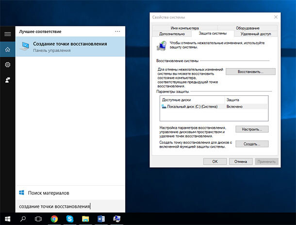 - Перейдите в меню «Пуск» или кликните окошко поиска, наберите «Создание точки восстановления» и нажмите Enter. Откроется вкладка «Защита системы» в окошке «Свойства системы», в котором можно внести изменения в настройку необходимой нам функции.