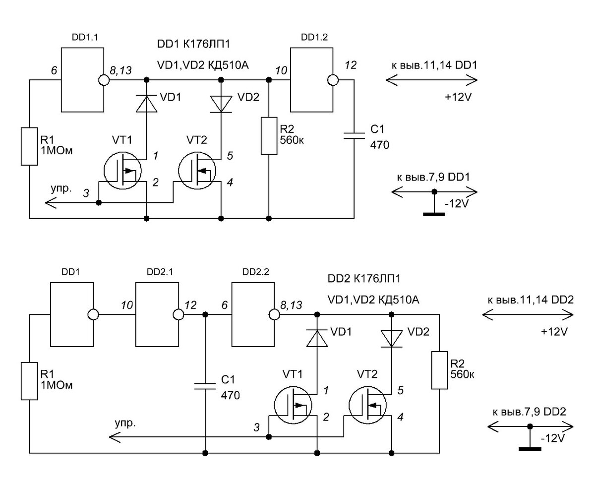 В «1» описан широтно-импульсный модулятор на одной КМОП схеме. Он выполнен на основе двух логических элементах (рис.1). Широтно-импульсный модулятор реализуется изменением коэффициента заполнения колебаний автогенератора в соответствии с входным напряжением. Регулирование коэффициента заполнения обеспечивается шунтированием времязадающего резистора R2 выходным сопротивлением полевых транзисторов. Коэффициент заполнения изменяется в пределах от 1до 99% периода рабочей частоты. Единственным недостатком этого генератора является то, что он не может запуститься при уменьшении величины времязадающего конденсатора С1 (при увеличении частоты генерации). Таким образом, начиная с некоторой величины емкости конденсатора C1 –времязадающая цепь деградирует. Предлагаю выполнить широтно-импульсный модулятор на трех логических элементах (рис.2). Различие между двухэлементным и трехэлементным генераторами заключается в том, что двухэлементный требует наличие конденсатора для возникновения колебаний