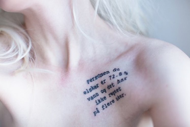 Обычно выбирают строчки из любимой песни, фразы на латыни, имена. Делают на самой косточке ключицы или по всей площади над грудью, иногда разбавляют рисунками животных, цветами, абстракцией.