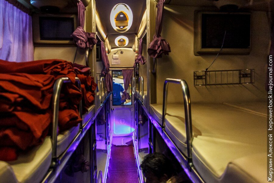 Не смотря на большой опыт путешествий, такое чудо я увидел впервые в жизни. Внешне выглядит как обычный междугородний автобус, а внутри что-то вроде плацкартного вагона поезда. Лежачие места в 2 этажа, с одной стороны двухместные, с другой одноместные.В нашем случае "купе" отгораживалось плотными шторками, но встречаются еще варианты со съезжающими в сторону пластиковыми дверцами. Если вы путешествуете один, очень важно приобрести одноместное "купе" либо выкупить все двухместное, потому что вам обязательно кого-то подселят и маловероятно, что это будет сексуальная молоденькая индианочка. В старых автобусах еще очень часто ползают тараканы, так что будьте готовы. В движении эти автобусы ужасно качает то ли от неровных дорог, то ли от мастерства индийских водителей.
