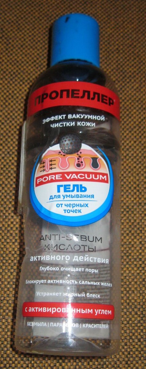 Гель для умывания Пропеллер от черных точек Pore Vacuum - отзыв Гель у меня почти кончился, поэтому фотографирую почти пустой флакончик: Гель имеет прозрачно-черный цвет: Не сушит кожу. Кожа после его использования матовая. Состав не плохой, даже если и есть какие вредные вещества, то они удалятся вместе с активированным углем. Гель для умывания против черных точек мне действительно помог, избавляет от черных точек, но он не сужает поры, поэтому с неделю, кажется, что поры сильно расширенны, потом они постепенно сужаются, но до не заметного состояния за все время его использования так и не дошли, видимо нужно использовать средства, специально сужающие поры, либо это уже особенность организма и все так и останется. Стоит недорого чуть больше 160 руб. Хватает на долго. Вывод: Бюджетный гель в необычном формате, который действительно помогает против черных точек Достоинства: безупречно удаляет макияж, не сушит кожу, недорого, необычный цвет, очищает, помогает против черны
