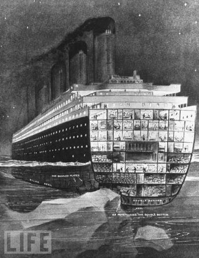 Из современных людей вообще никто не понимает, в чем была сущность затопления этого судна. Дело в том, что все военные корабли той эпохи строились с двойными бортами, а все гражданские суда - только с одинарными бортами. Это значит, что внутри каждого боевого корабля за первым наружным бортом с толстой обшивкой обязательно шел второй борт с более тонкой обшивкой. но если от взрыва снаряда наружный борт любого военного корабля получал водотечность, то второй борт так же как и второе дно предотвращал распространение воды по всему трюму. Но Титаник как и все остальные гражданские суда того времени не имел двойных бортов. Поэтому Вода протекающая через тысячи отверстий от ослабших заклепок медленно заполняла его трюмы. И спасти его было уже невозможно. Водооткачивающая система не справлялась.