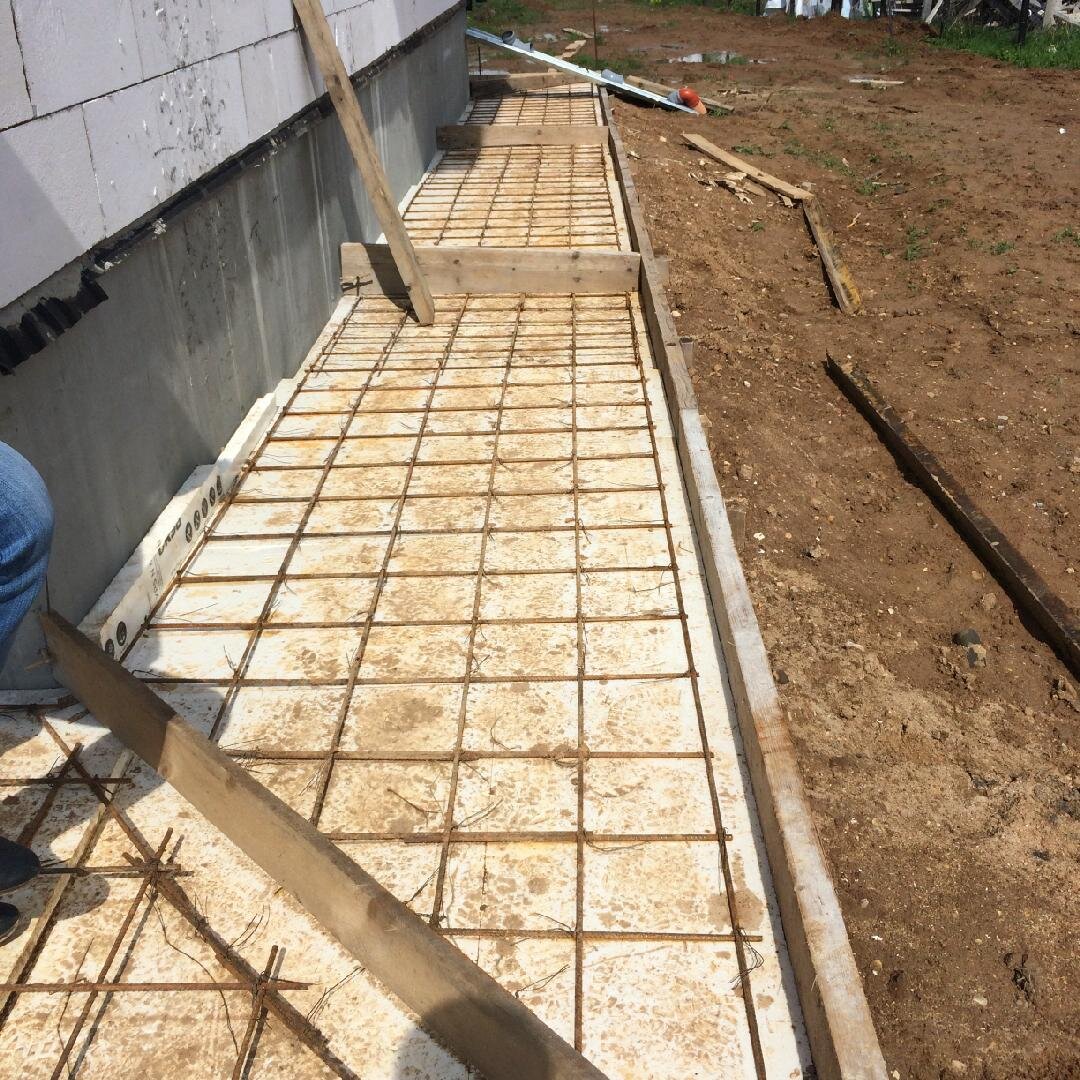 Чтобы увеличить срок службы фундамента, нужно защитить его от воздействия атмосферных осадков, с этой задачей хорошо справляется правильно залитая отмостка. Первым шагом нужно подготовить основание для отмостка, для этого производим выборку грунта для создания 20 см толщины подушки затем засыпаем щебнем средней фракции или пгс и производим уплотнение.Сделав трамбовку размечаем будущую отмостку при помощи колышков и шнура. Самой оптимальной шириной будет один метр, что позволит использовать отмостку в качестве тропинки. Следующим этапом будем возведение опалубки и укладка гидроизоляции, делаем опалубку так чтобы получился уклон от стороны фундамента а так же гидроизоляцию укладываем с нахлестом на фундамент. Армировать можно готовой сеткой с размером ячеек 15х15см, армирующая сетка должна уложена на расстояние 3-5 см от подушки для создания защитного слоя. Выполнив подготовку приступаем к заливке бетоном, раствор готовим в пропорции 1 :3 это одна часть цемента на три равные части пе