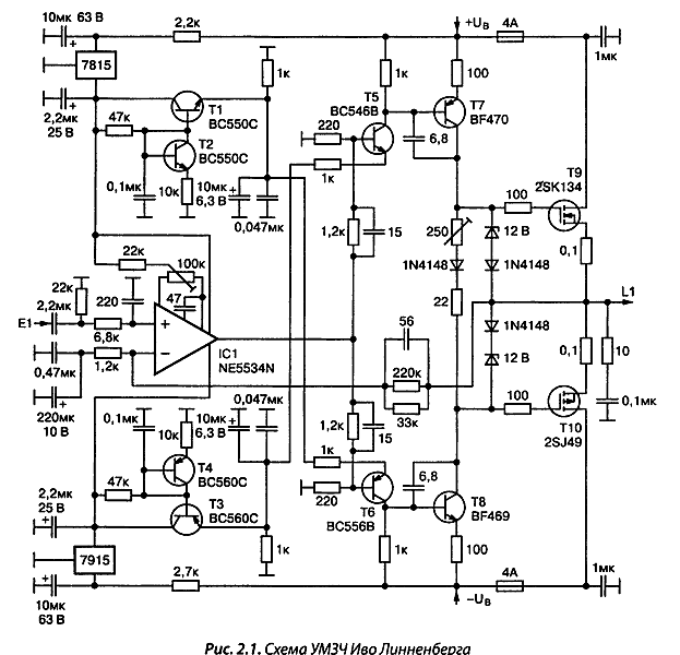 Построение усилителей мощности звуковой частоты (УМЗЧ) на полевых транзисторах привлекает разработчиков возможностью достижения «ламповой» мягкости звучания (вольтамперные характеристики полевых транзисторов очень похожи на аналогичные характеристики вакуумных ламп) и в то же время дает возможность отказаться от «камня преткновения» ламповых усилителей — выходного трансформатора. В УМЗЧ Иво Линненберга (рис. 2.1) для усиления по напряжению применен специально разработанный для звуковых применений мало- шумящий с низким коэффициентом гармоник ОУ NE5534 и симметричный усилитель на биполярных транзисторах Т5—Т8. Усиление по току выполняет комплементарная пара мощных комплементарных полевых транзисторов Т9, Т10. Примечание. Полевые транзисторы менее чувствительны к перегрузкам, чем биполярные, поэтому для защиты от замыкания нагрузки оказалось достаточно установленных в цепях затворов 12-вольтовых стабилитронов, ограничивающих выходной ток до 8 А. Усилитель имеет чувствительность