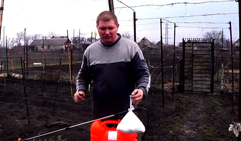 В этом выпуске я расскажу вам о первой весенней обработке винограда по голой почке. А так же я Вам расскажу, чем именно нужно обрабатывать сад и виноград. Что такое обработка по голой почке - это обработка в период пока не началось «сокодвижение» в растениях и почки еще не начали в полной мере получать питательные вещества. Для обработки по голой почке мы будем использовать трех процентную «бордосскую жидкость». Чередовать данную обработку нужно с обработкой медным купоросом. Сейчас я расскажу рецепт приготовления «бордосской жидкости», который использую лично я. Для приготовления однопроцентной «бордосской жидкости» нам необходим медный купорос в количестве 100 грамм и известь в количестве 100 грамм. Данные препараты разводим отдельно в пластиковых емкостях в небольшом количестве теплой воды. Чтобы понять, что, во что вливать есть специальная хитрость - берем небо и вливаем его в молоко, то есть мы вливаем раствор медного купороса в известковое молочко. Данное количество компонентов