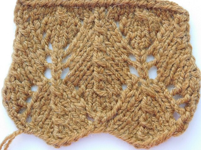 И снова узорчик с мотивами из листьев и ажуром Вам в копилочку. Он очень подходит для оформления края изделия, т.к. делает его зигзагообразным. Красиво смотрятся рукава, выполненные такой техникой. Ну вот и он. И по традиции его схема. А теперь давайте рассмотрим каждый ряд подробнее. На схеме показаны только лицевые (нечетные) ряды. Четные ряды вяжем по рисунку, накиды провязываем изнаночными. Набираем на спицы 21 петлю, плюс две кромочные (на схеме они не указаны). Вяжем их кстати, как обычно: первую всегда снимаем, последнюю провязываем изнаночной. Благодаря этому по краю получается косичка. 1 рад: 1 кромочная, 1 лиц. петля, 1 накид, 3 лиц. петли, три вместе лицевой (техника выполнения подробна показана в условных обозначениях к схеме), 3 лиц. петли, 1 накид, 1 лиц. петля, 1 накид, 3 лиц. петли, три вместе лицевой, 3 лиц. петли, 1 накид, 1 лиц. петля, 1 кромочная. 3 ряд: 1 кромочная, 1 лиц. петля, 1 накид, 3 лиц. петли, три вместе лицевой, 3 лиц. петли, 1 накид, 1 лиц. петля, 1 нак