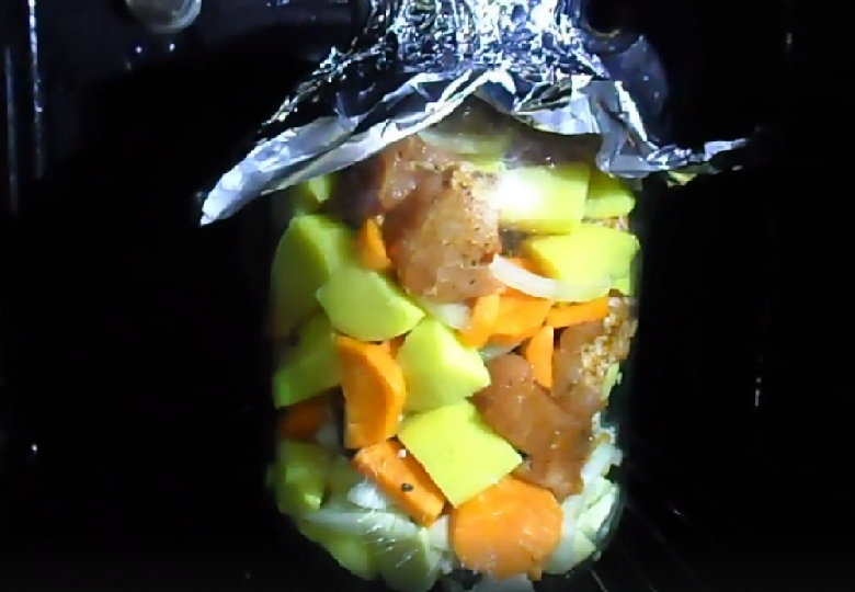 4. Накрываем банку фольгой и ставим в ХОЛОДНУЮ духовку. Закрываем дверцу и только потом включаем нагрев на 180 градусов, готовим 2 часа не открывая дверцы. По истечении времени духовку выключаем и даем банке немного там остыть, минут 10-15 и только тогда открываем дверцу и достаем наше жаркое.
