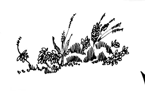 В этой статье покажу как я это делаю обычно - постепенно и по возможности разнообразно набирая пером различные простые графические типы, которые создают в целом впечатление, что мы видим перед собой сложный и симпатичный ковер зелени, состоящий из множества типов растительности, земли и камня. Первая идея, которой я руководствуюсь при рисовании, это - микс различных типов графики - травинки, пучки травы, листочки, маленькие веточки, камни, мелкие камушки, сор - все это создаёт идею естественности, и достаточно легко выражается с помощью пера и туши, за счёт уникального типа штриха пера. Вариативность линии пера в данном случае само, автоматически создаёт утонченное графическое разнообразие линии - штрих работает на нашу задачу, помогая нам в процессе рисования. Чередование различных приемов рисования травы создаёт пространство, по которому глазу зрителя двига