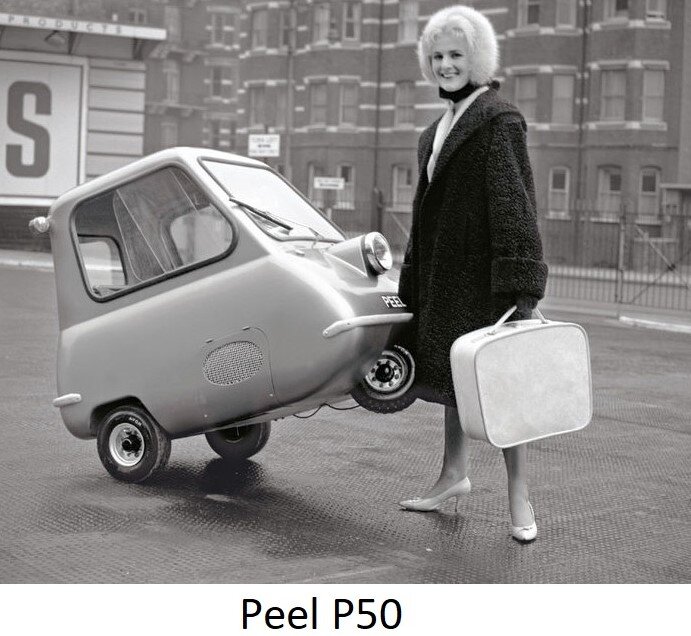 Мне стало интересно как могли выглядеть самые интересные и не обычные автомобили 100-200 лет назад. Перерыл много информации в интернете и нашел пять интересных автомобилей. 1. Peel P50 На первое место я решил поставить автомобиль чуть-чуть не стандартной формы, его размеры схожи с большим современным чемоданом. Этот автомобиль был одноместным, годы выпуска пришлись на период с 1962 по 1965. Стоимость данного авто составляла 560 долларов. Из-за его маленького веса в 56 кг и ручке на задней части автомобиля, его можно было возить с собой. Его максимальная скорость составляла 61 км/ч. 2. Messerschmitt KR175 Второе место получает автомобиль который создавался в после военное время. Этот автомобиль был создан компанией которая производила самолеты. После того как они получили запрет на производство самолетов в голову пришла идея на создание авто. Автомобиль выпускался с 1953 по 1955. KR175 был жутко не удобным автомобилем, двухместная и неудобная кабина, вместо руля использовался руль о
