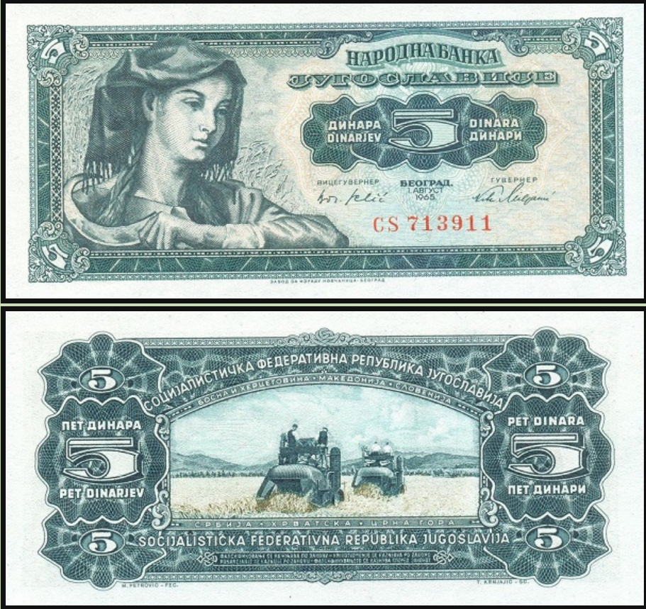 В первой части я упоминал про банкноты выпущенные 1966 году и датированные 1965 годом,но так как у меня их в коллекции нет, про них статьи я не писал. Это были банкноты номиналами 5,10,50 и 100 динаров Оформление этих банкнот схоже с оформлением банкнот 1963 года выпуска,кроме банкноты 100 динаров - она уже исполнена в новом оформлении ,которое повторят последующие выпуски. А это банкнота 100 динаров 1965 года уже из моей коллекции Дата выпуска 1 августа 1965 года. На банкнотах стоит подпись управляющего Николы Милянича. Свой пост он занимал до 1969 года. В 1977 году на пост управляющего приходит Ксенте Богоев. Банкноты 100 динаров 1978 года уже выходят с его подписью и выпускаются так до 1986 года. Материал - бумага. Печатались в типографии Института Производства банкнот и монет – Топчидер (Topcider), Белград . Печать выполнена в красном цвете , водяные знаки отсутствуют. На лицевой стороне изображена скульптура "Мир" ,автор которой скульптор Антун Августинчич. Справа от нее над