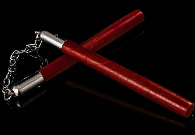 Это, пожалуй, самый популярный вид оружия ко-будо, особенно среди молодежи. И, действительно, достаточно связать между собой веревкой два бруска дерева – и мы получаем оружие более быстрое и мощное, чем палка той же длины. Как известно, нунчаку – исконно сельскохозяйственный инструмент, то есть короткий цеп для обмолота риса. Цеп использовался как оружие и на Западе. Он имел долее длинную рукоять. Короткое звено оковывалось железом, усеивалось шипами. Крестьяне легко могли достать конного рыцаря и оглушить его. У чешских гуситов были отряды крестьян с цепами, представлявшими опасность для неповоротливых рыцарей. Считается, что раньше всего цеп как оружие, стал использоваться в Китае. Как говорит легенда, основатель династии Сун (960-1271) Чжао Куаньинь, сражаясь на шестах с бандитом Хо, сломал конец своего шеста, вернее, надломил его. Став от этого более гибким, шест надоумил правителя использовать в боевых действиях цеп. Состоявший из двух половин, цеп лянцхегунь был популярен в Ш