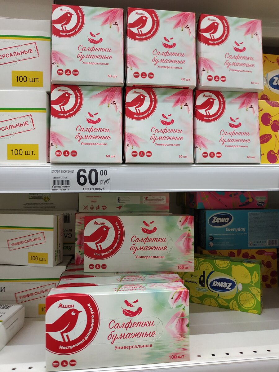 В гипермаркетах Ашан представлено множество товаров собственной торговой марки Ашан с красной птичкой. посмотрим на них. Салфетки бумажные. Туалетная бумага.