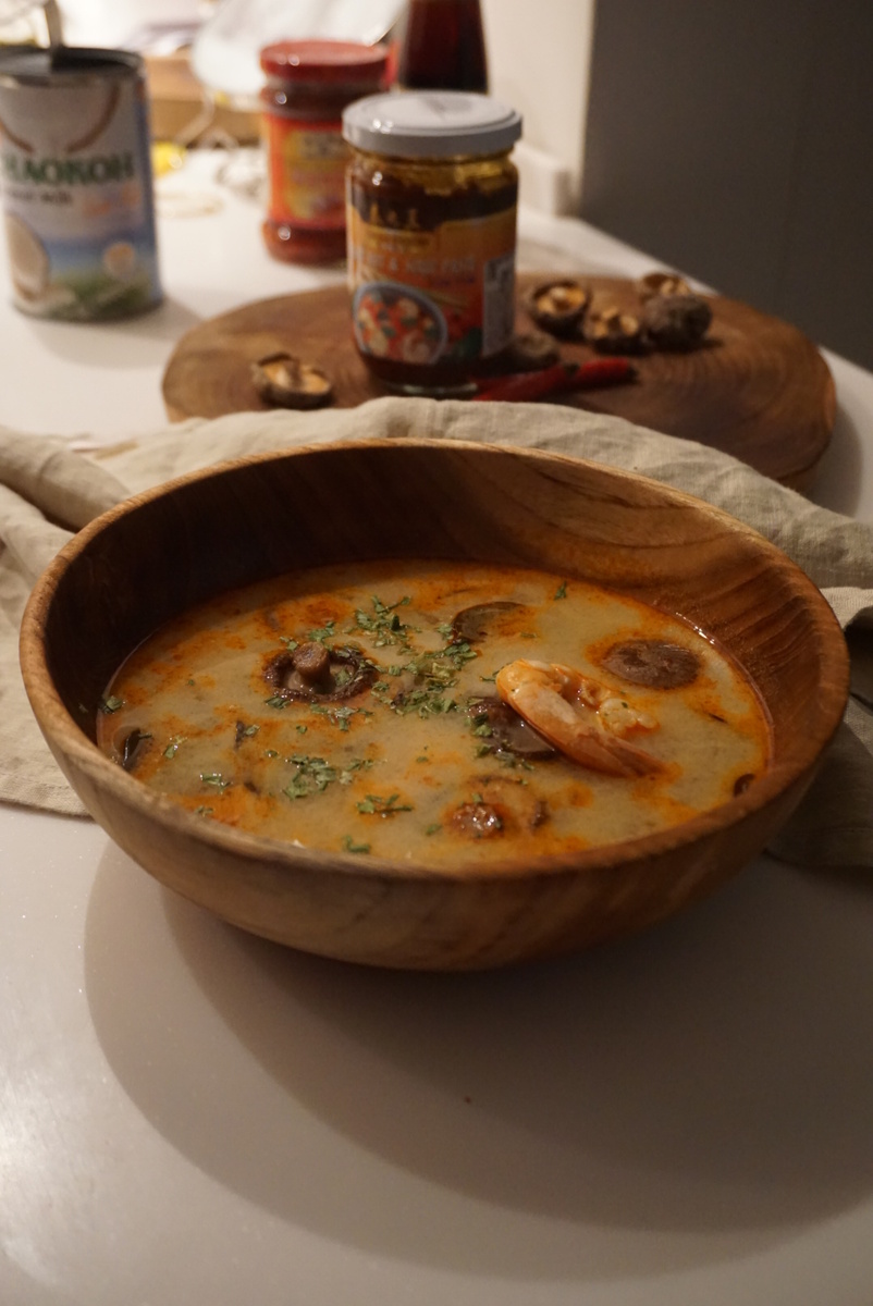 Это базовый рецепт супа Том Ям с кокосовым молоком. Кокосовое молоко придает супу немного кремовой текстуры и делает его менее острым.