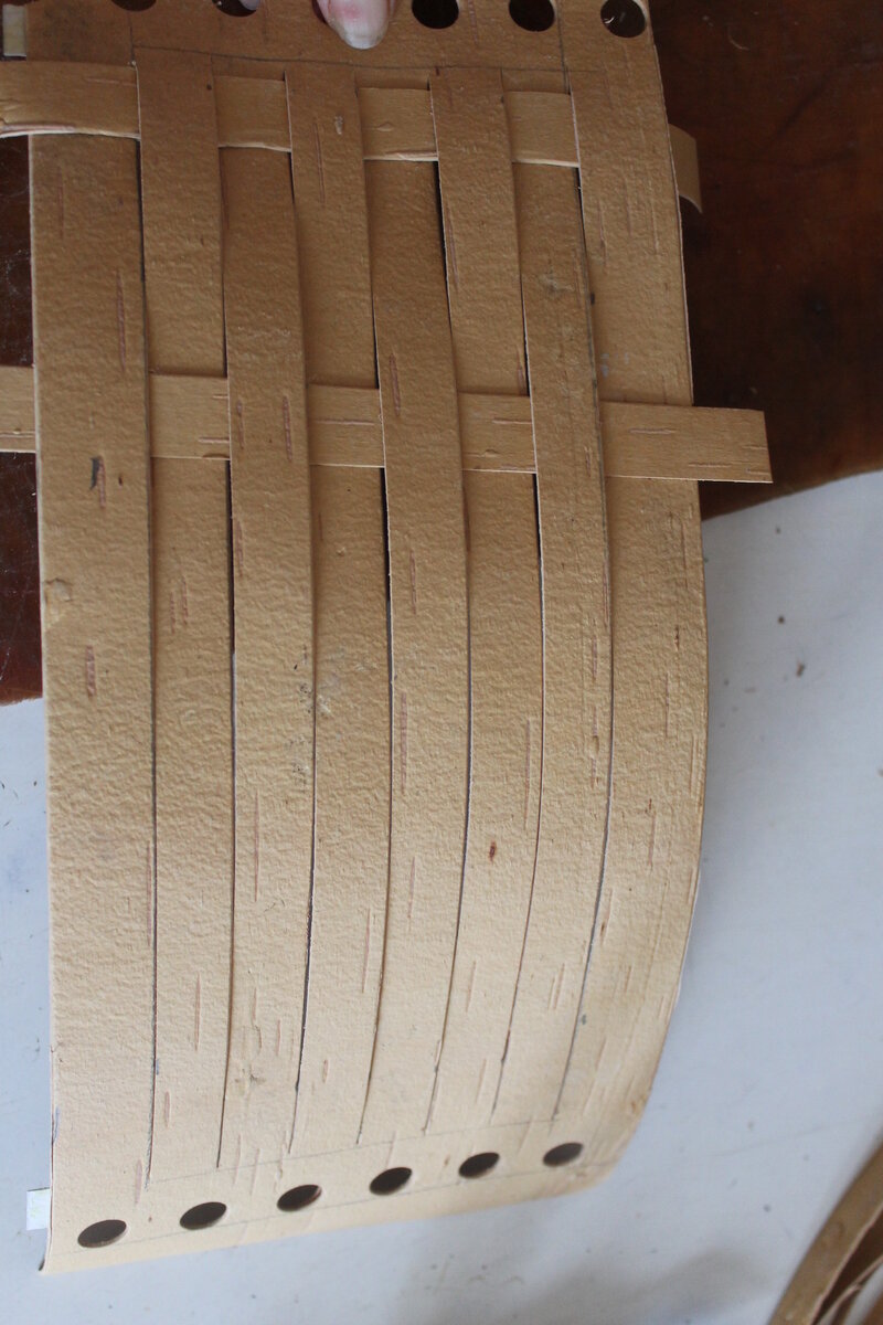 А почему плетение "фальшивое"? Потому что верхний слой корпуса туеска получается не полностью плетёным, как классические плетёные изделия. Он делается как для обычного простого туеска. Точно также, как и на простом туеске делается "замок". А потом на заготовке верхнего слоя делается ряд длинных горизонтальных разрезов через 1,5 см. Получаются полоски для плетения, но не отдельные, а соединённые по краям. Полоски как часть единого берестяного полотна. Естественно разрезы вдоль волокон сильно ослабляют верхний слой нашего будущего туеска. Поэтому для того, чтоб корпус не разорвался, мы приклеиваем с внутренней стороны заготовки две вертикальных полоски бумаги по краям. Теперь нужно нарезать вертикальные полоски бересты, кото
