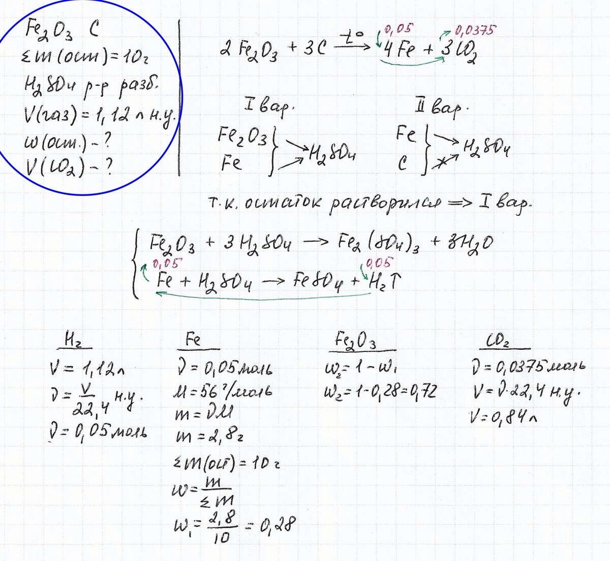 Схема алгоритма решения традиционно составляется по вопросу задачи "Определите массовые доли веществ в твердом остатке и объем углекислого газа (н.у.), образовавшегося в первом опыте". Массовую долю железа легко определить по массе железа (рассчитывается по количеству вещества железа 0,05 моль) и общей массе твердого остатка (10,0 г). Массовая доля оксида железа определяется еще легче (28% железо, 100-28=72% оксид железа). Объем углекислого газа определяем по известной формуле количества вещества для газов при н.у.