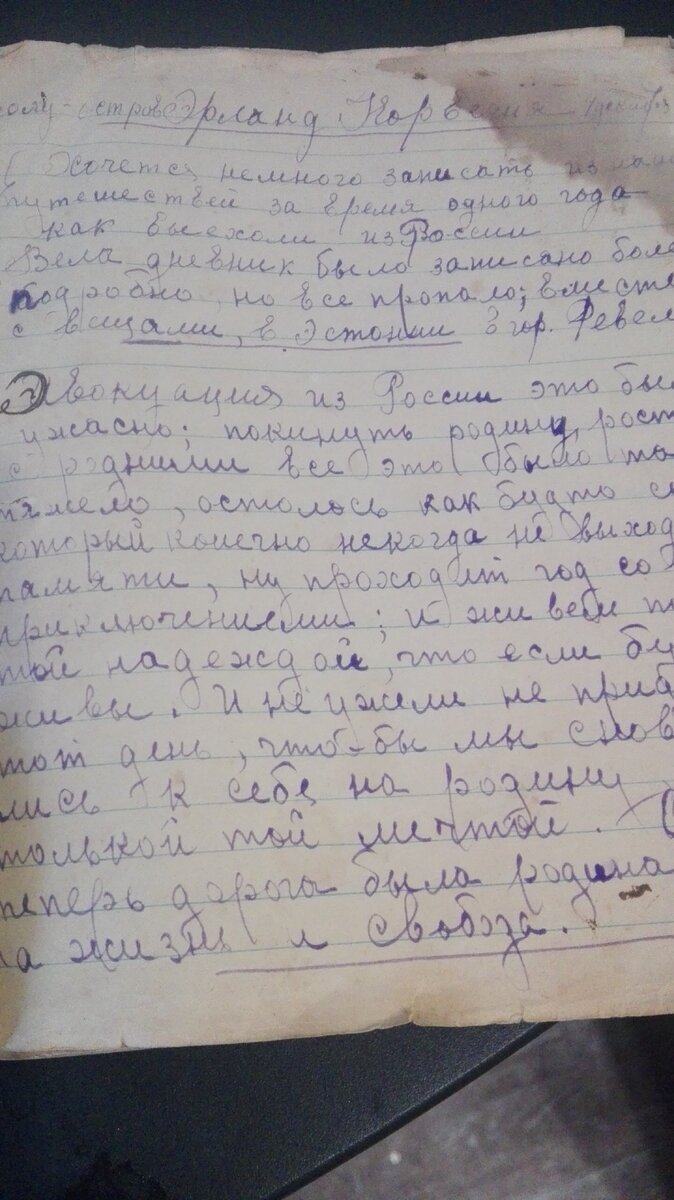 Этот дневник достался мне от моей прабабушки Александры Михайловны. В нем, она описывает пережитые события Великой Отечественной Войны, рассказывает, как их эвакуировали,как разлучили с детьми, все ужасы и горе этого страшного времени. Прабабушка Александра Михайловна жила с семьей в Ленинградской области. И вот, как она начинает дневник. На фото можно разглядеть текс, но я его перепишу, для более понятного содержания. "Хочется немного записать из наших путешествий, за время одного года, как выехали из России. Вела дневник было записано более подробно, но все пропало, вместе с вещами в Эстонии. Эвакуация из России это было ужасно, покинуть родину, расстаться с родными, все это было так тяжел, осталось как будто сон, конечно который никогда не выходит и памяти, ну проходит год со всякими приключениями и живем только той надеждой,что если будем живы. И неужели не придет тот день, чтобы мы снова вернулись к себе на родину, живем только только той мечтой. О, как бы теперь была дорога роди