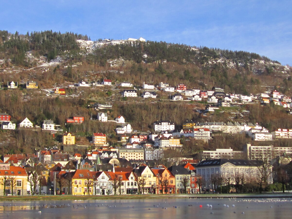 Будем подниматься на гору Флёйен. Она видна на фото. Сверху - смотровая площадка. Посмотрим с нее на зимний припорошенный снегом Берген. Отправляемся в путь. На гору можно подняться за десять минут и на фуникулере Флёйбанен. Но мы воспользуемся великолепной солнечной погодой и пройдемся пешком. Вот так, несколько горделиво, располагаются дома на склонах горы. Для пешеходов проложен асфальтированный серпантин. Сейчас он немного запорошен снегом. Очень живописная дорога. Полюбуемся домами в альпийском стиле. В укромном местечке между кустами и скалой с солнечной стороны я обнаружила цветущую веточку вишни. Очень трогательно она выглядела в конце января... Настоящая зимняя вишня... Симпатичная семейная пара троллей желает нам приятной доброй дороги. Так выглядит гора с обратной от Бергена стороны. Очень красиво. Стоит пройтись этим маршрутом, чтобы полюбоваться отсюда на озеро. Это - источник питьевой воды в Бергене. Когда видишь такую табличку, ноги сами несут в путешеств