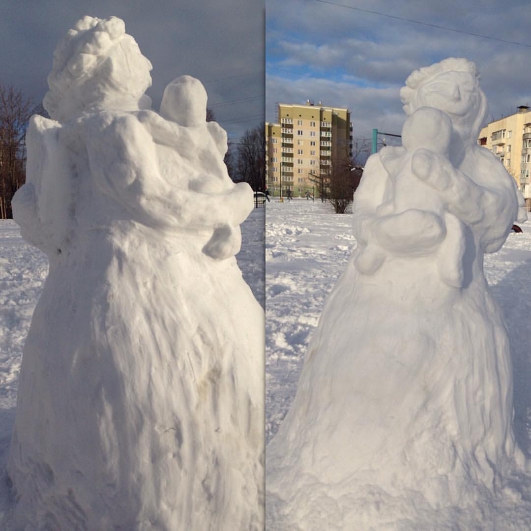 Смотрите, какую шикарную мать с младенцем мы слепили в прошлом году. Это семейный наш подряд. У матери коса, длинная юбка и рюкзак. Простояло это шедевральное творение наших шести рук меньше суток ) сначала все с ним фоткались, а потом пришли бессовестные дети и всё разломали.
