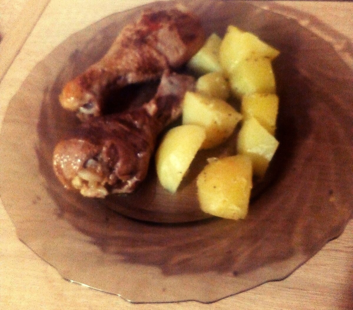 Давайте сегодня попробуем приготовить ужин в мультиварке. Потушим куриные голени и одновременно отварим картофель на пару. Возьмём куриные голени и щедро обмажем каждую приправами. Можно выбрать любое сочетание соли и специй по вашему вкусу или взять готовую приправу для курицы. Включим мультиварку в режиме жарки. Нальём на дно чаши немного растительного масла и выложим туда ножки. Через пять минут перевернём их и начнём нарезать крупными кубиками подготовленный заранее картофель. Как только курица слегка подрумянится, добавим воды, чтобы она слегка покрывала голени. Можно также добавить немного соевого соуса. Устанавливаем в чашу ёмкость для приготовления на пару и выкладываем в неё картофель. Закрываем крышку и выставляем режим «тушение» на один час. Спустя полчаса откроем крышку и посыплем картофель солью и прованскими травами. Осталось выждать ещё тридцать минут, и блюдо готово. Можно смело наслаждаться вкусом.