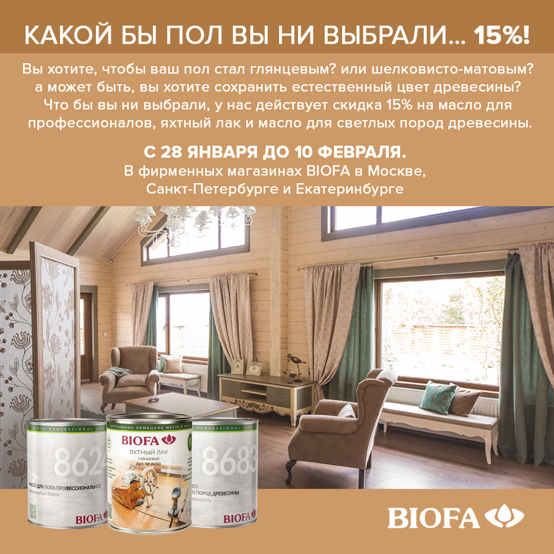 Что бы вы ни выбрали, у нас действует скидка 15% на масло профессиональное (арт.8624), яхтный лак (арт.8050) и масло для светлых пород древесины Bianco (арт.8683).