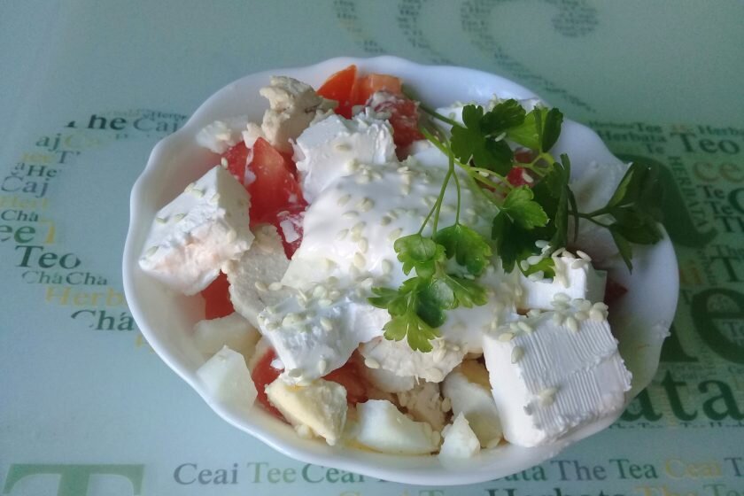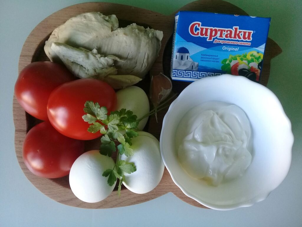 Салат с сыром фета — очень вкусная и легкая в приготовлении закуска, без добавления майонеза. Ингредиенты Приготовление Куриное филе и яйца отварить, остудить и порезать небольшими кусочками. Сыр и помидоры нарезать кубиками. Если в салате использовать черри, то достаточно разделить их на 2-3 части. Чтобы приготовить сметанный соус, нужно смешать сметану с чесноком, пропущенным через пресс. При желании можно добавить мелко порубленную зелень. Салат с сыром фета подают порционно или в общем салатнике. Выкладывать можно слоями или смешать ингредиенты, положив сверху соус. Выкладывать слоями следующим образом: Салат с сыром фета получается очень вкусным. Осталось его украсить и можно подавать к столу. Это прекрасная закуска перед основным блюдом. Салат прекрасно сочетается с листьями салата и рукколой! Зелень предаст ему пикантности и летней свежести. Приятного аппетита!