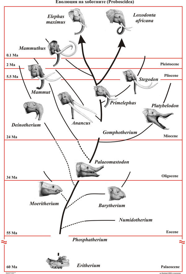Сегодня семейство хоботных представлено только тремя видами: индийский слон, лесной и саванный африканские слоны. Но у этого семейства интереснейшая история, богатая причудливыми существами. Для начала надо отметить, что хоботные относятся к большому надотряду афротериев. Когда от остальных частей Гондваны откололась Африка вместе с Аравией, там из мелких насекомоядных созданий появились афротерии. К ним относятся хоботные, сирены, даманы, трубкозубы, прыгунчики и тенреки, а также ряд вымерших семейств млекопитающих. Узнать об их родственных связях удалось благодаря молекулярной систематике, которая основана на анализе генов. Древнейшим известным нам хоботным является эритерий. Он жил 60 миллионов лет назад и известен только по небольшим обломкам челюсти. Палеонтологи предполагают, что эритерий был в длину около полуметра, а весил примерно 4-5 килограммов. Его окаменелые останки были обнаружены в Марокко. Реконструкция, размещенная ниже, очень схематична. В Марокко в 1996 году нашли
