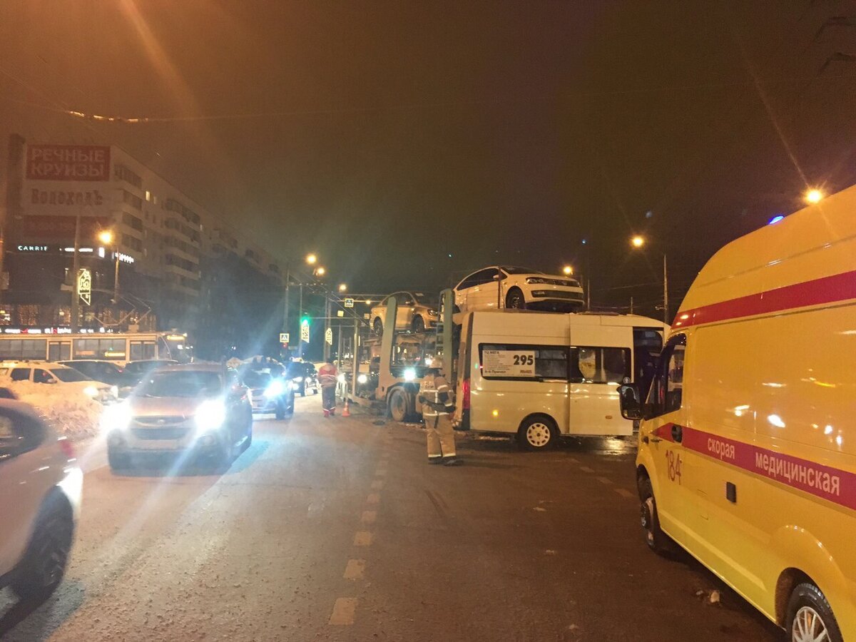 Всего в результате столкновения маршрутки и автовоза пострадали четверо. Авария произошла в понедельник, 28 января, в районе пересечении Московского шоссе и Ново-Вокзальной. Столкнулись маршрутка №295 и большегруз, который перевозил автомобили. В настоящий момент известно, что пострадало 4 человека. Двоим медики оказали помощь на месте ДТП, от госпитализации они отказались. Двоих жителей Самары доставили в больницу.