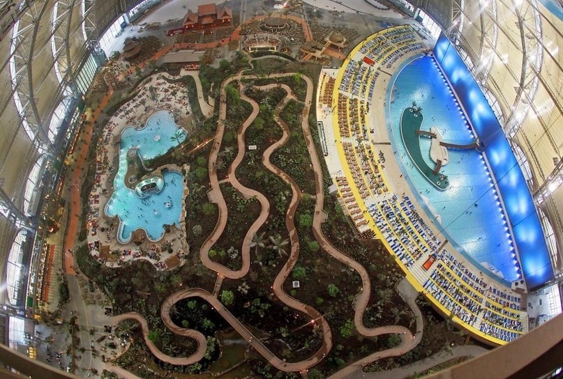 Крупнейший в мире крытый тропический курорт Курорт "Тропические острова" - это искусственный тропический курорт, расположенный примерно в 60 км к югу от Берлина на территории самой большей в бывшей ГДР военной авиабазы. Точнее сказать, в бывшем эллинге (ангар для дирижаблей), принадлежавшем ранее фирме Cargolifter AG и называвшемся Aerium. Поэтому сооружение Tropical Islands иногда также называют Aerium. Сооружение также является крупнейшим самонесущим залом мира. Аквапарк представляет собой павильон длиной 360 метров, шириной 210 и высотой 107 метров, площадью 66000 кв.м, в котором воссоздан климат тропиков. Внутри могут разместиться восемь футбольных полей, американская статуя Свободы (93 м) "стоя", а парижская Эйфелева башня (322 м) "лёжа". В аквапарке Тропические острова поддерживается температура воздуха не ниже 25 градусов, воды - 28 градусов. Влажность в разных местах от 30 до 60%. Парк разделён на следующие тематические области и включает в себя тропический лес "Цветочный мир"