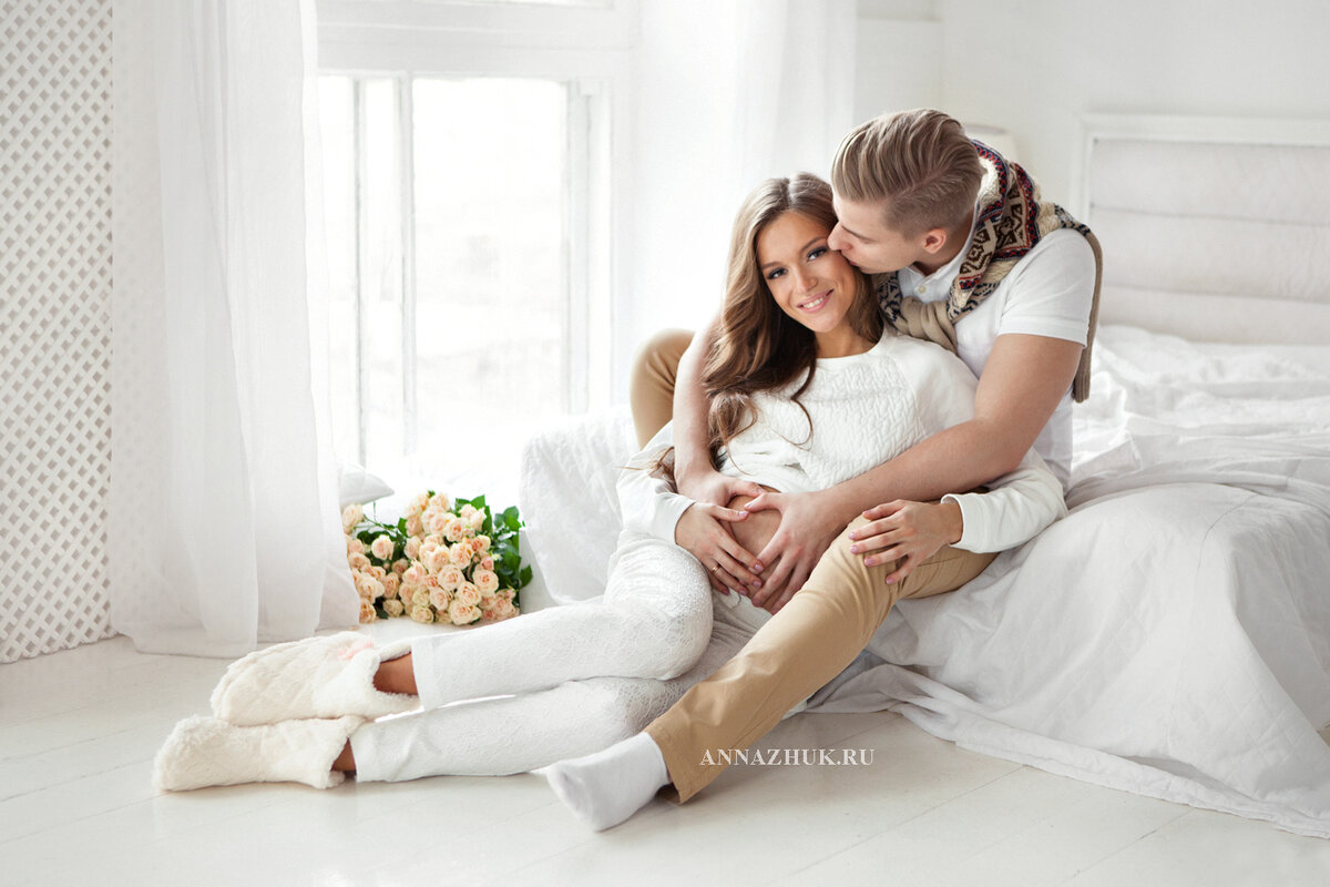 Для фотосессии беременности с мужем в студии имеет смысл выбирать светлые тона. Из-за отражения света от стен, черты вашего лица будут интереснее, чем в темной студии. http://annazhuk.ru/anja-i-denis