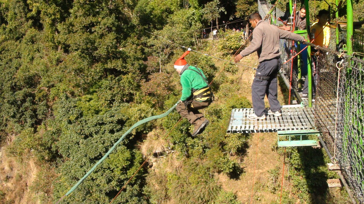 Часть вторая. Непал и водопад Виктория. Непал. Ласт Резорт, 160 м. Совсем недалеко от Тибетской границы, из Катманду четыре -пять часов езды в зависимости от состояния дороги. На подъезде машину пару раз осматривали местные военные. Стартовая площадка - деревенский металлический навесной мост, по которому за час до прыжков ходил народ с курами подмышкой. Посередине моста маленькая калитка в мир адреналина и небольшой выступ, где все и происходит. Когда подходит время банджи, мост перекрывают для мирного населения, калитка открывается, и два «непальцем» деланные парня приступают к управлению сложной системой противовесов из пластиковых 40-литровых (на глаз) фляг с водой, которые возвращают резинку наверх после очередного прыжка. Когда посмотришь как это работает, возникает здоровое желание покинуть мостик. Если помните «Назад в будущее - I», как в самом начале готовится завтрак Дока - вот примерно такая последовательность движений и звуков железок, «ведер» , канатов и карабинов. «Стари